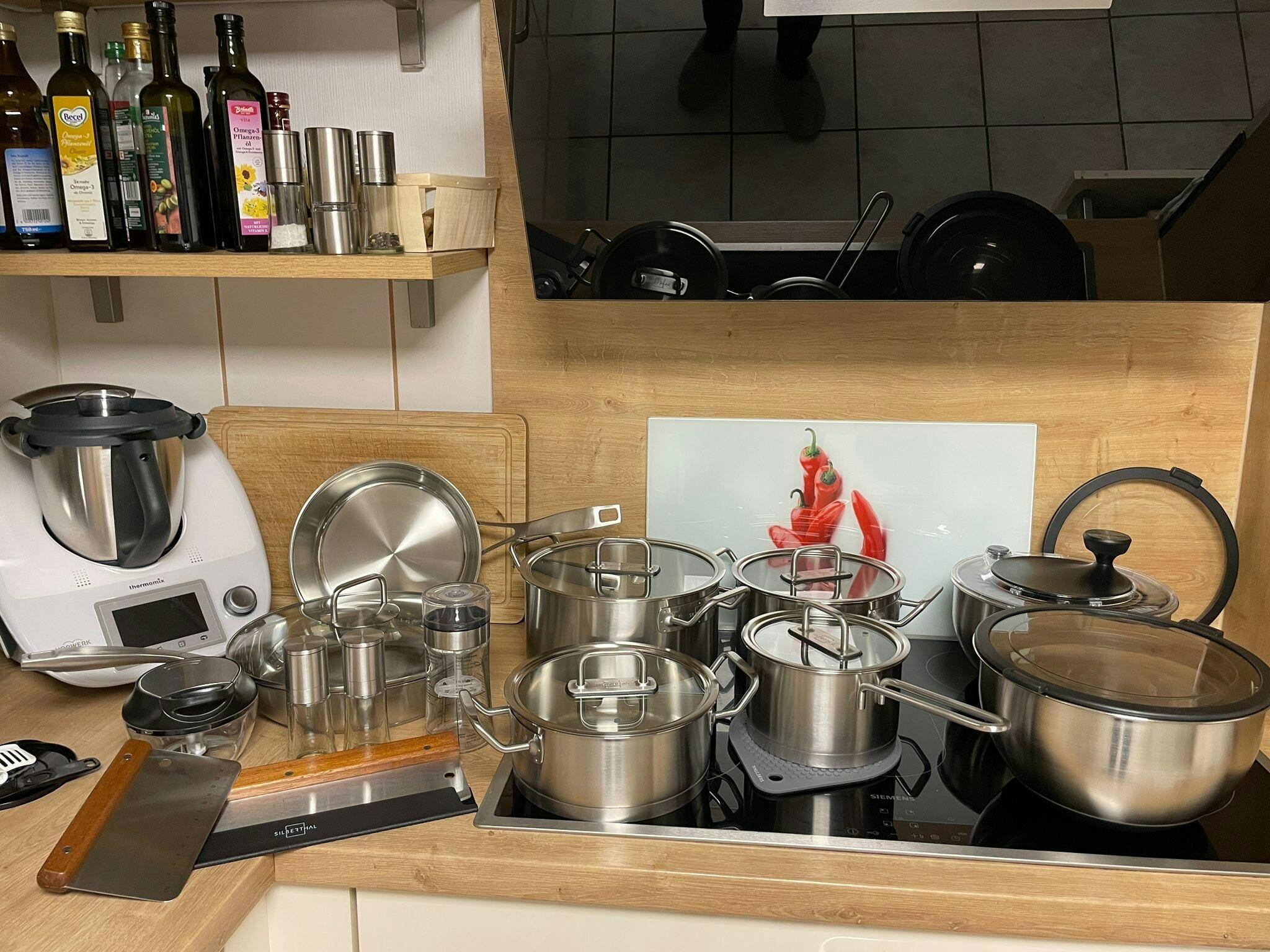 - Edelstahlkonstruktion: Robust genug für den Einsatz in Edelstahlpfannen und hitzebeständig.