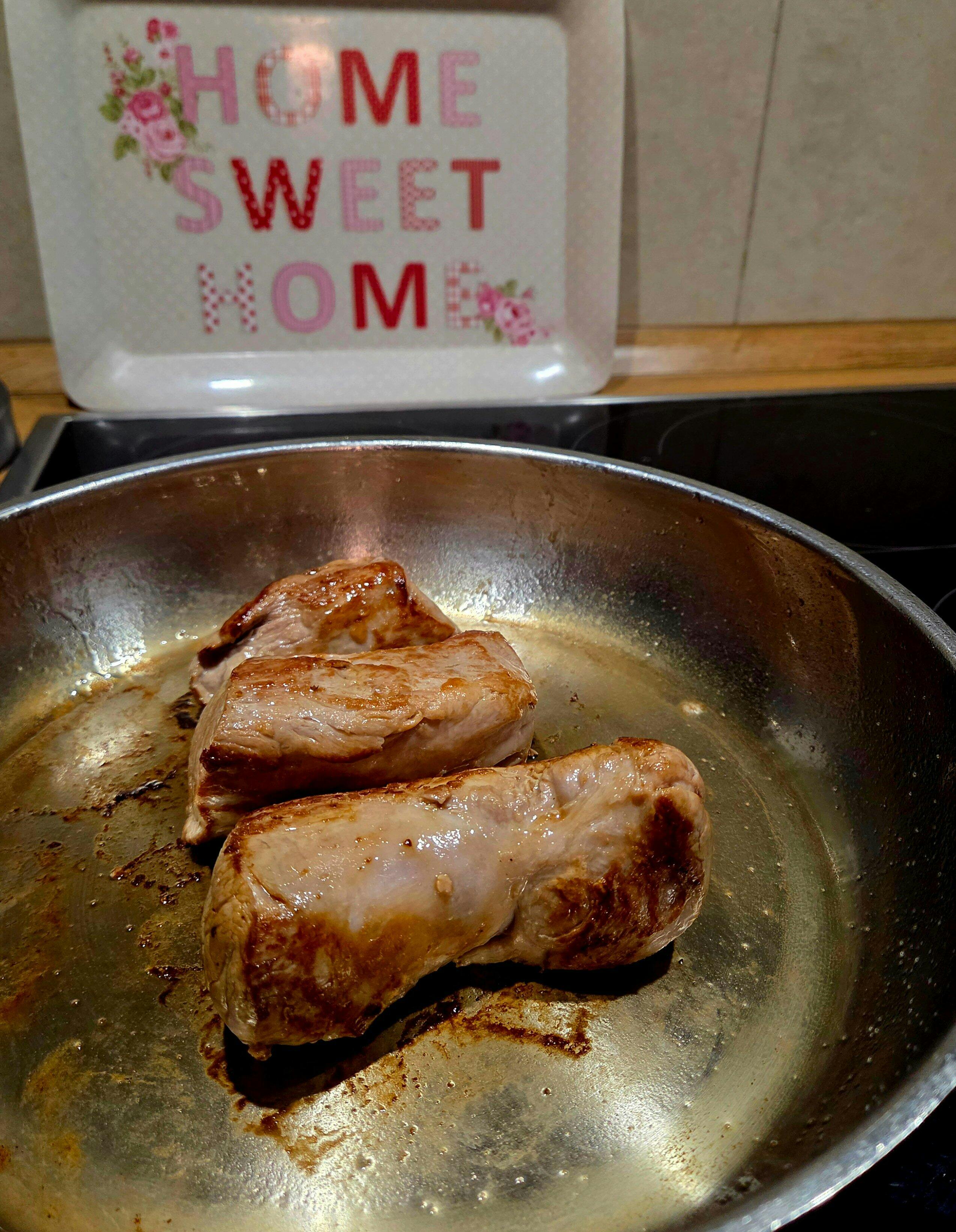 - Fleisch in die Pfanne legen, kurz andrücken. Keine Gabel verwenden, denn spitze Gegenstände verletzen das Fleisch