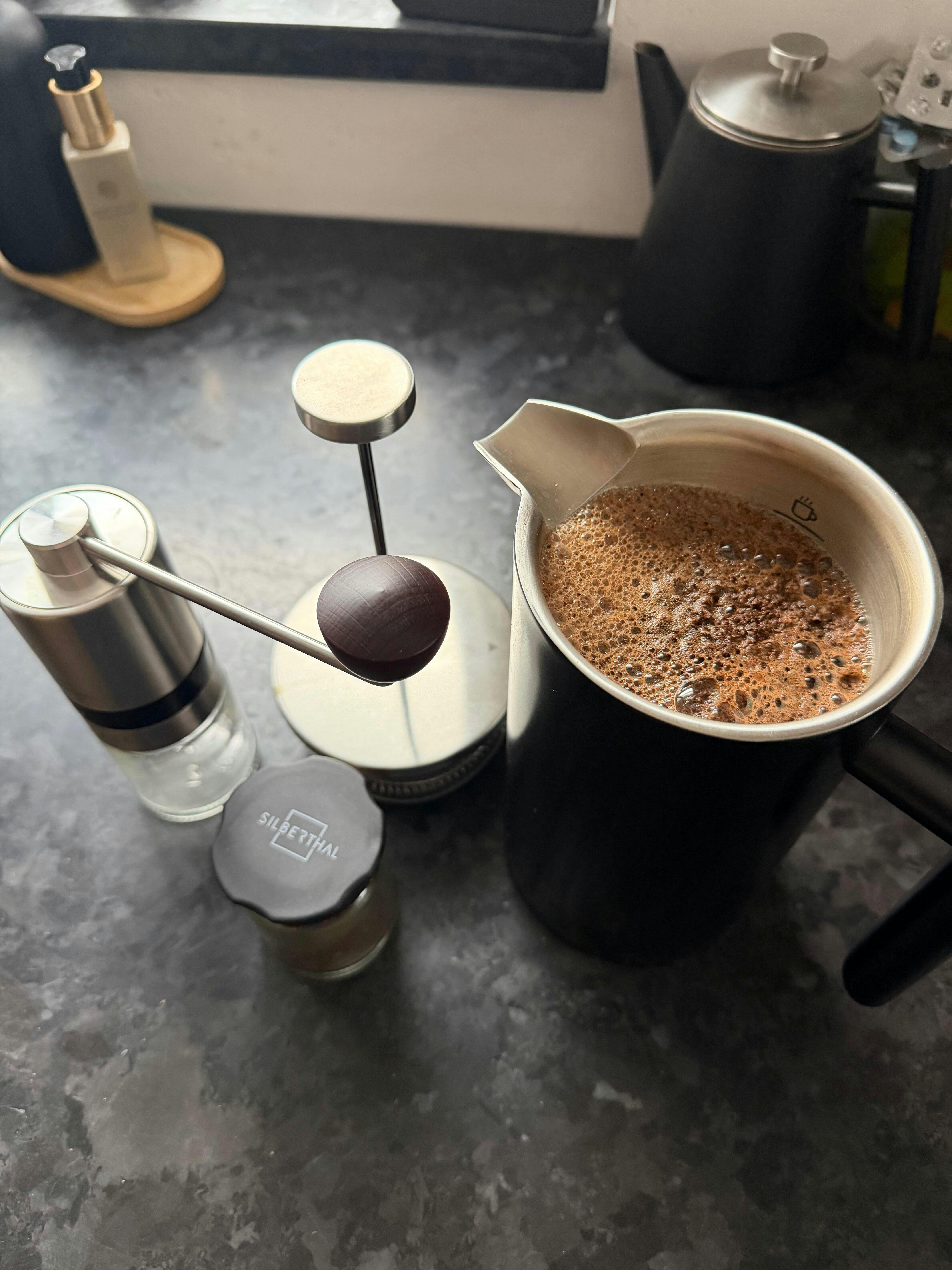 Das hängt vor allem von deinem Geschmack ab, aber grundsätzlich empfehlen wir etwa 60 Gramm auf einen Liter Wasser. Das entspricht 1,5 Gläsern mit Kaffeemehl aus deiner Kaffeemühle. Gieße das Pulver mit etwas abgekühltem heißem Wasser (ca. 90° C) auf und rühre einmal vorsichtig um. Lasse den aufgebrühten Kaffee etwa 4 Minuten stehen, bevor du den Stempel langsam herunterdrückst.