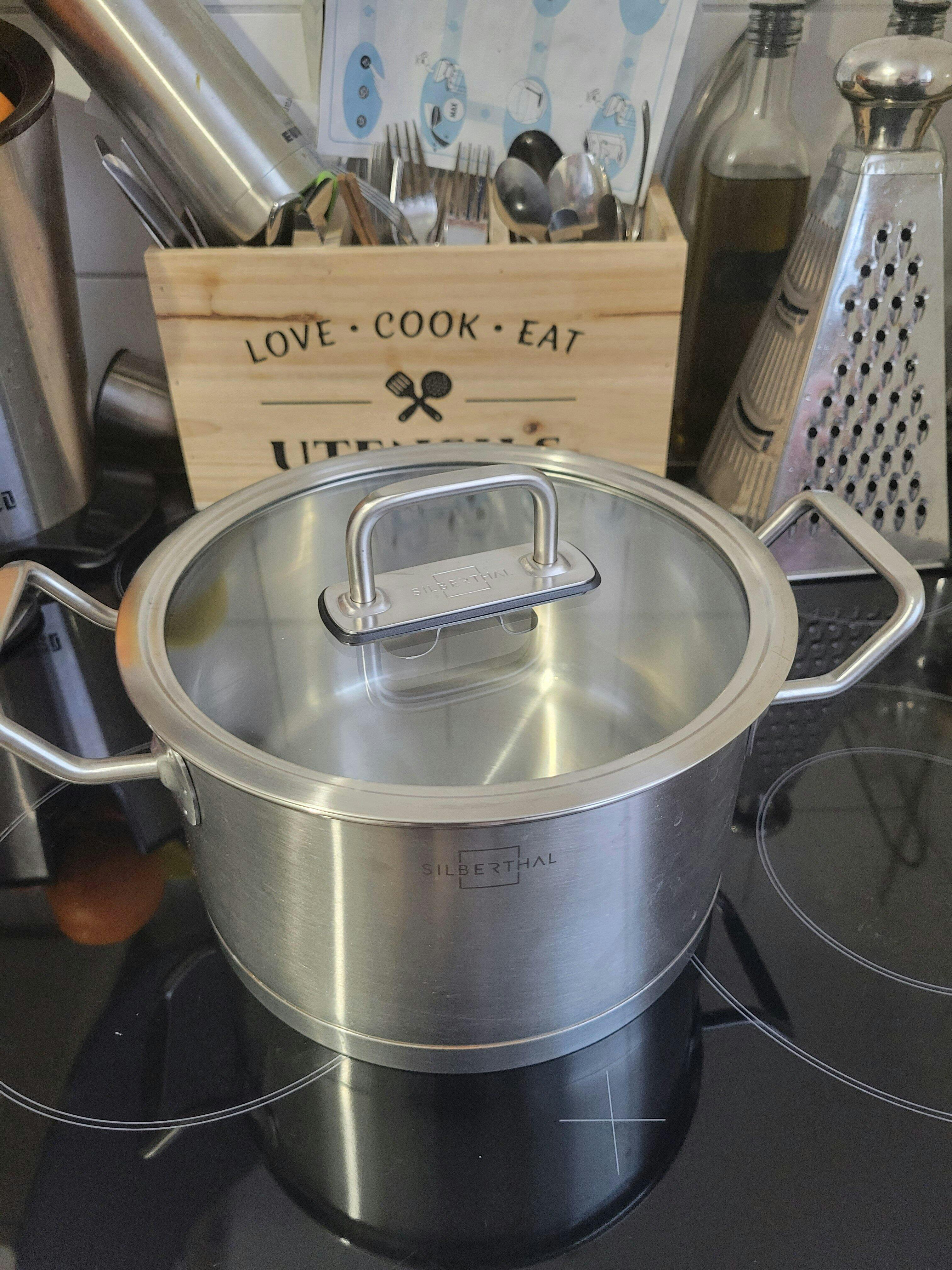 Die kühl bleibenden Griffe, der breite Schüttrand und der passende Deckel aus Glas machen das Kochen sehr mühelos und über den hohen Rand spritzt auch nichts hinaus.