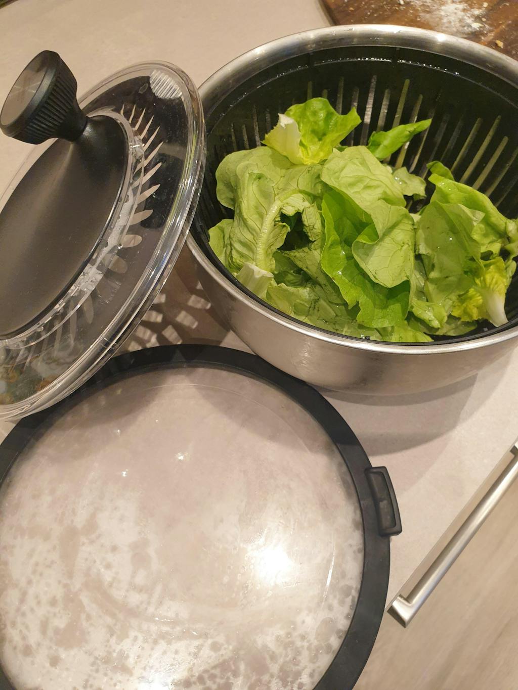 - Befüllen: Öffne die Salatschleuder und lege die gewaschenen Salatblätter in den Korb. Achte darauf, den Korb nicht zu überfüllen, damit die Blätter ausreichend Platz zum Trocknen haben.