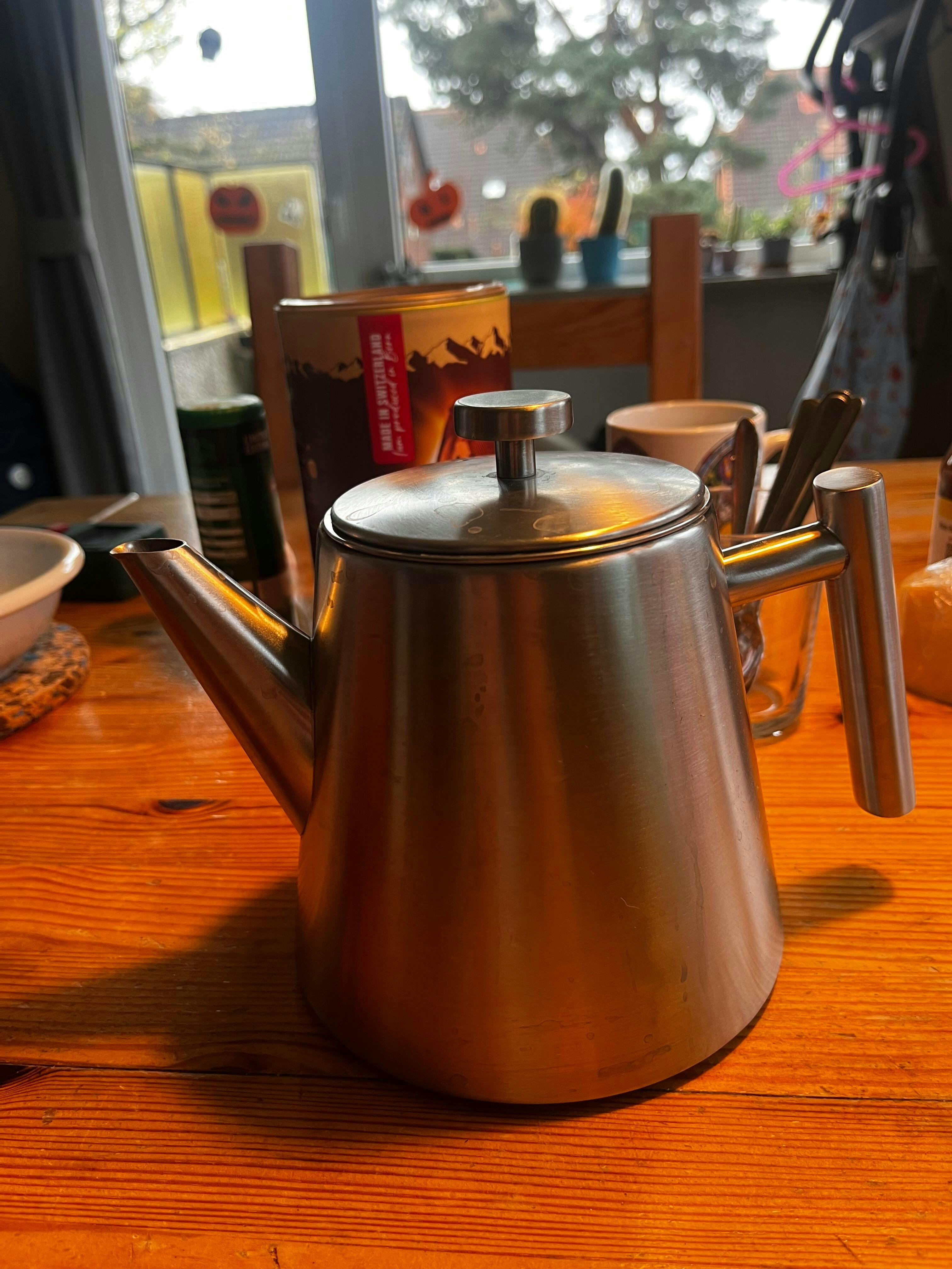 Das Sieb ist, wie die ganze Kanne, aus Edelstahl.