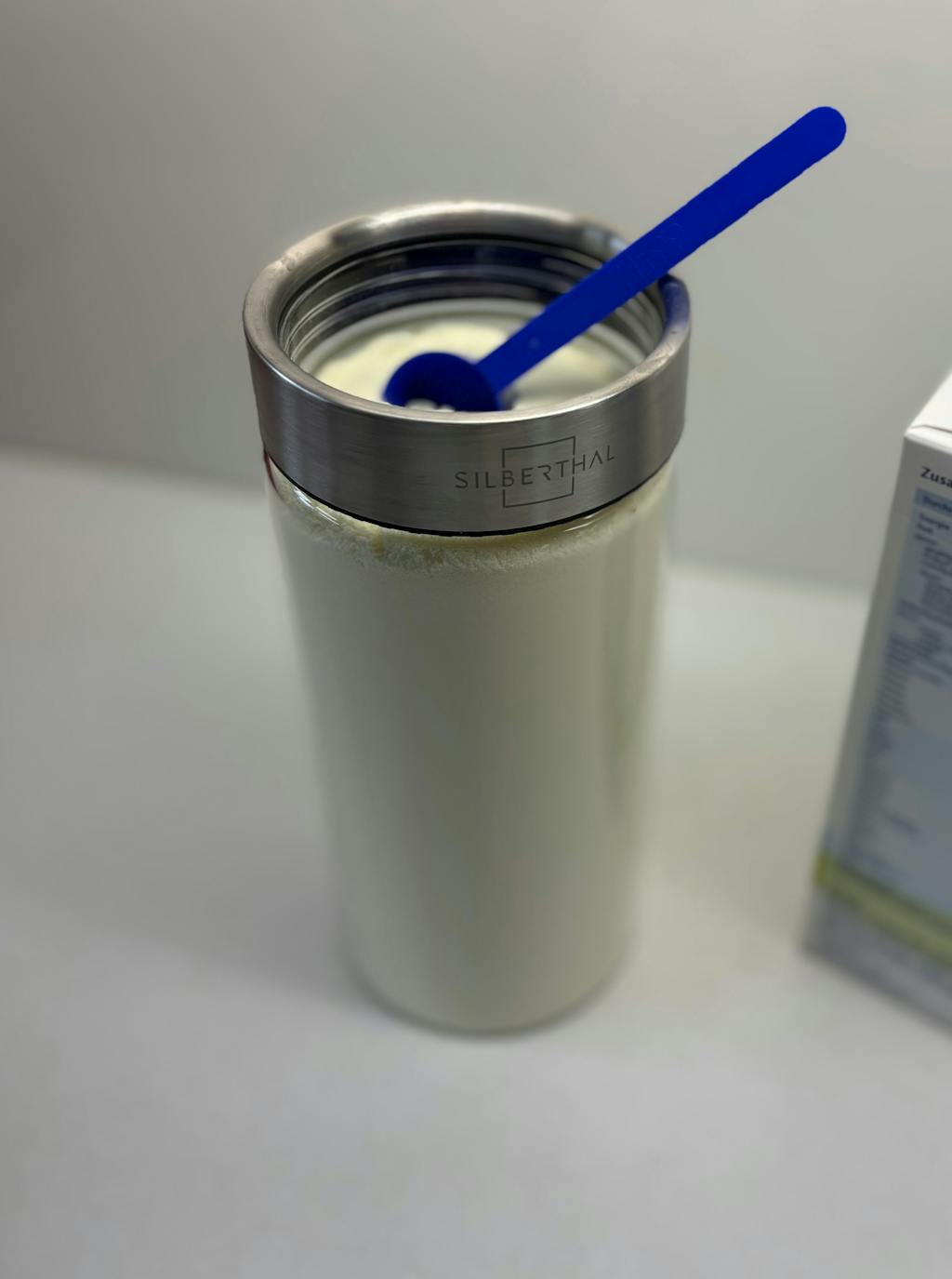 - Anschließend kannst du anhand des Messbechers ablesen, wie viel Milliliter 100 g deines Vorrates benötigen.