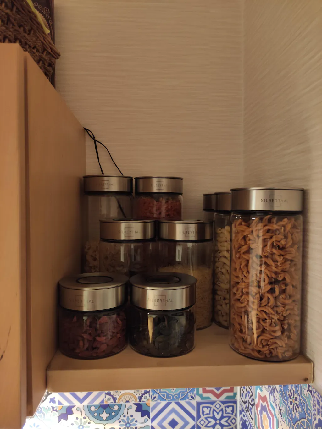 Die transparenten Glasbehälter für Lebensmittel mit Aufklebern zur Kennzeichnung sorgen für einen organisierten und dekorativen Überblick von deinem Vorrat in der Küche.